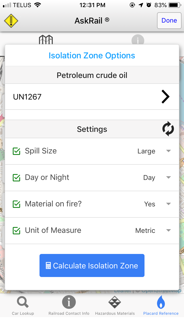 If we click on the UN Number or the placard, we can call up the ERG guide page, and visualize the isolation zone.
